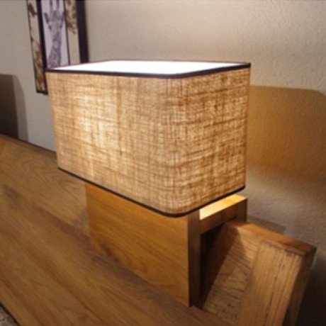 Светильник выполнен из массива древесины тика и абажура из ткани мягкого бежевого оттенка. Конструкция этого светильника позволяет использовать его как настольный, настенный и даже разместить на спинке кровати.