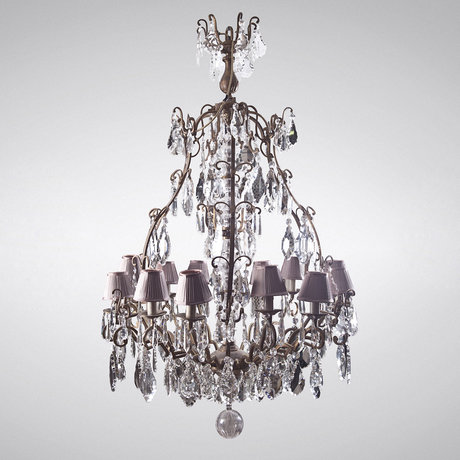 Элегантная подвесная люстра на роскошном латунном каркасе с завитками. Украшают каркас множество стеклянных гирлянд и подвесок.