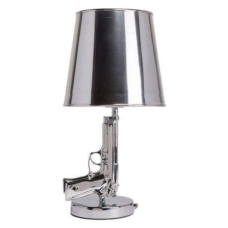 Необычная настольная лампа с ножкой в форме пистолета станет оригинальным дополнением современного и классического интерьера. Корпус светильника отлит из полимерной смолы и покрыт серебряным напылением. Белый абажур внутри также имеет золотое шелкографное покрытие, обеспечивающее мягкое спокойное освещение. Тип лампочки: Е27.
