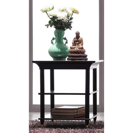 Небольшой приставной столик из красного дерева весьма универсален: благодаря классическому дизайну и компактному размеру его можно поставить в гостиной, спальне, прихожей. Столик оснащен тремя полочками, ножки украшены металлическими наконечниками золотого цвета.