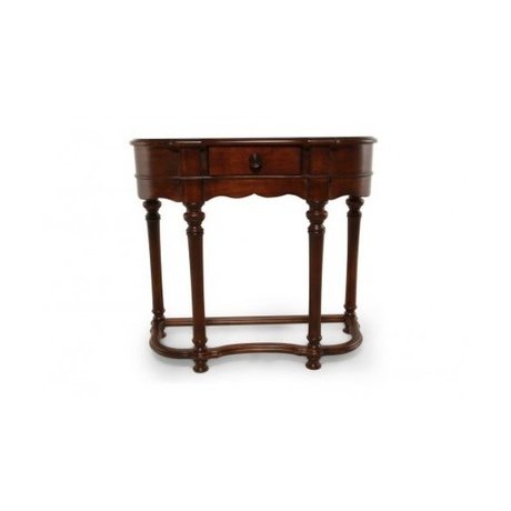 Утонченный и женственный пристенный столик представляет собой функциональный блок из столешницы и выдвижного ящика, расположенный на тонких резных ножках. Верхняя часть со скругленными углами повторяется снизу изящной точеной перекладиной. Стол выполнен в глубоком коричневом цвете, слегка состаренном, что придает ему очарование винтажного стиля.