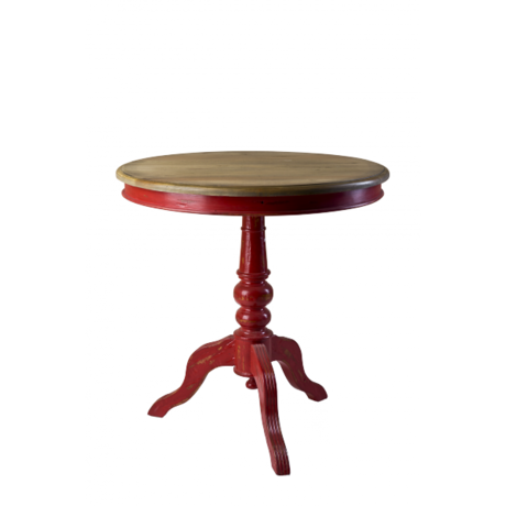 Удобный и очень оригинальный стол на классической резной ножке. Красное дерево, из массива которого выполнен стол, искусственно состарен с имитацией текстуры, провалов и трещин. Окрашено основание стола в красный глянцевый цвет. Круглая столешница выполнена из гладкого массива, при окрашивании сохранен естественный цвет и рисунок дерева. Стол станет ярким акцентом в вашей гостиной или парадной.