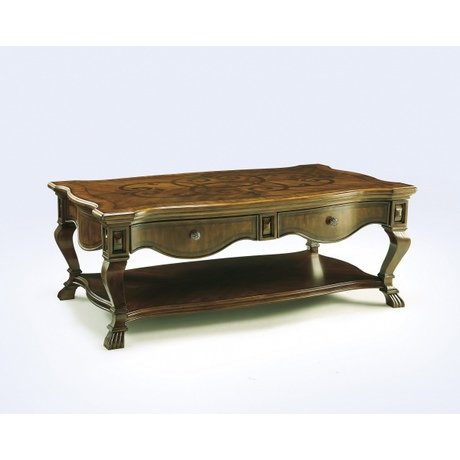 Стол имеет дополнительную нижнюю полку и два выдвижных ящика. Резные массивные ножки украшены декором цвета античной латуни.