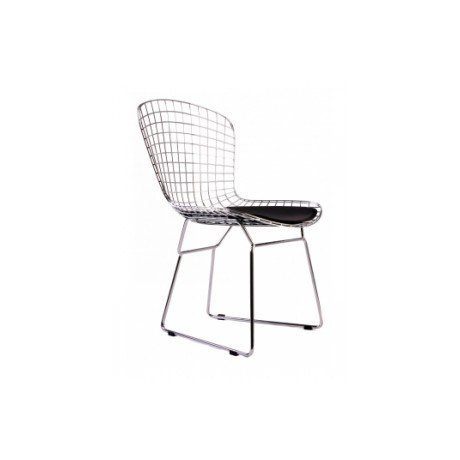Стильный и удобный стул для кухни или столовой, выполненный в лаконичном легком дизайне. Каркас производится из хромированных алюминиевых прутьев, сваренных по специальной технологии. Подушка сидения изготавливается из натуральной кожи и крепится к основанию при помощи крючков. Модель является репродукцией модели Harry Bertoia Wire Side Chair.