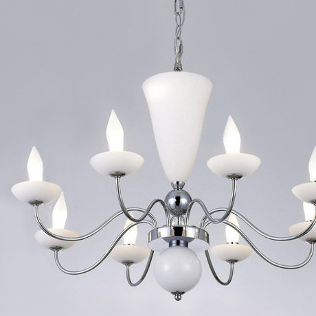 Люстра 10-ти рожковая из коллекции ST Luce на хромированной арматуре. Дизайн ламп выполнен в виде свечей в подсвечниках. Декор: стеклянные чашечки, ваза и шар белого цвета на арматуре. Высота светильника регулируется.