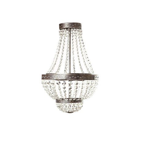 Люстра выполнена из серебристого металла с греческими орнаментами и украшена прозрачными подвесками в стиле Сталинского Ампира, подойдет для освещения небольшого пространства или в комплексе световых аксессуаров.