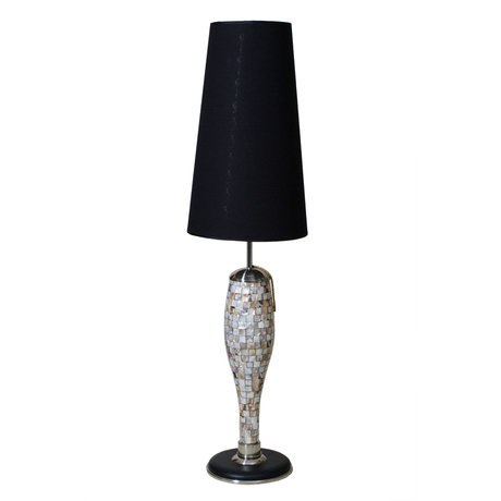 Высокая лаконичная лампа с утонченным основанием выполненным перламутровой мозайкой. Темный тканевый абажур придает лампе оригинальности. Она станет прекрасным акцентом в любом помещении.