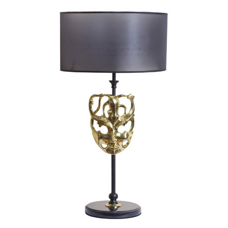 Изящная настольная лампа на тонкой ножке в венецианском стиле, которую украшает аутентичный декор в форме золотой маски. Абажур выполнен из атласа пепельного оттенка.