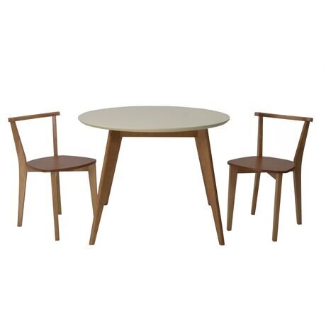 Комплект из деревянного стола Сканди на каркасе из натурального дерева и 2 стула Франк отлично подойдет к интерьеру, выдержанному в скандинавском стиле. Данный комплект станет центральным элементом в гостиной, столовой зоне, на кухне, позволив создать уютное обеденное место, где смогут собираться члены дружной семьи и их гости.У модели круглая форма столешницы. Такое решение исключит риск сколов и обеспечит безопасность, в том числе, детям.
