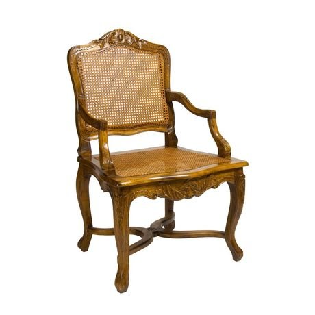 Изысканный резной стул из массива дерева. Спинка, подлокотники и перекрестие, соединяющее ножки, изящно выгнуты. Вставки из ротанга на спинке и сиденье. Украсит интерьере квартиры или загородного дома.
