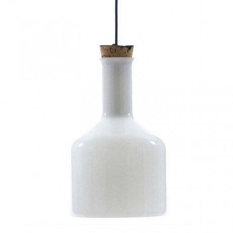 Подвесной светильник Labware, состоящий из выдувного, белого, матового стекла, с вкрученной пробкой из коры пробкового дуба и гибким кабельным шнуром.