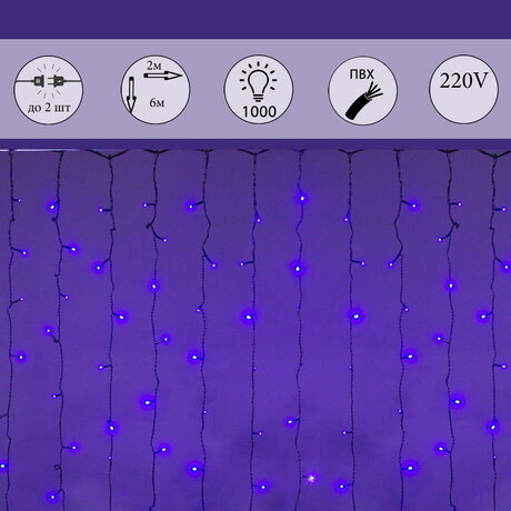 - Питание — стандартная розетка 220V, не требует специальной проводки - Длина — 6 метров по ширине и 2 метра в высоту - Количество диодов — 1000 LED-огней синего цвета - Водонепроницаемость — защита ПВХ позволяет использовать в условиях повышенной влажности - Энергопотребление — экономичное, можно оставлять включенным на длительное время - Возможность соединения — до 2 штук последовательно для создания еще более масштабных световых композиций Светодиодный занавес A-950 станет идеальным решением для новогоднего оформления, свадебных церемоний, дней рождения и тематических вечеринок. Простая сборка займет не более 15 минут, а эффект превзойдет все ожидания.Отзывы