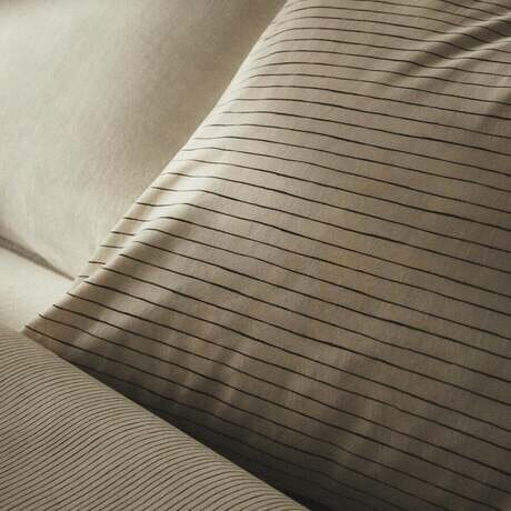 Наволочка из перкаля плотностью 200 нитей с двусторонним полосатым принтом с узкими полосками с одной стороны и более широкими полосами с другой Внутренний клапан с одной стороны, за исключением размеров 45 x 110 см и 45 x 155 см, открытые с обоих концов.
