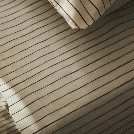 Плоский лист из перкаля плотностью 200 нитей с двусторонним полосатым принтом, состоящим из узких полос с одной стороны и более широких с другой.