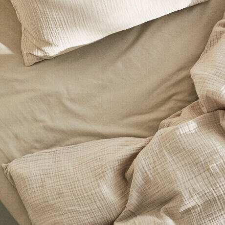 Простыня из плотного хлопка с плотностью 144 нити, подходит для матрасов до 23 см. Она мягкая и прочная, легко стирается и сохраняет форму.