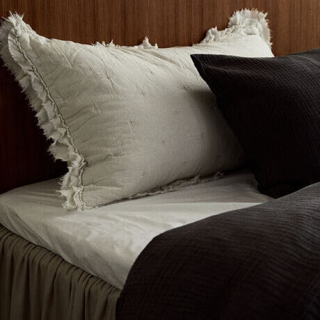 Наволочка из хлопка с легкой ватной, стеганой передней стороной и воланом по краям. Гладкая задняя сторона с скрытой молнией.