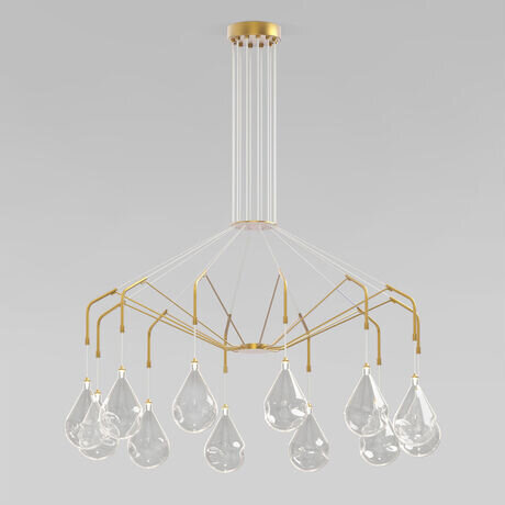 Люстра станет центральным элементом в помещении от 10 м². Оптимальная высота потолков — от 2,7 м, чтобы раскрыть потенциал регулируемого подвеса. Особенно гармонично светильник впишется в минималистичные интерьеры, лофт или современную классику. Дизайн с латунной арматурой и стеклянными каплями привлечет внимание ценителей нестандартных решений и тех, кто ищет баланс между декоративностью и функциональностью.Технические характеристики: