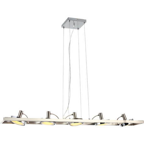 Назначение светильника: для гостиной, Стиль светильника: модерн, Материал светильника: металл, стекло, Высота: 1200 мм, Длина: 1100 мм, Ширина: 175 мм, Количество ламп: 5 шт, Тип лампы: светодиодная, Мощность: 5 Вт, Патрон: LED, Цвет арматуры: матовый никель/хром