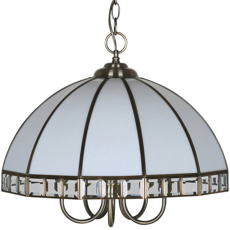 Назначение светильника: для комнаты, Стиль светильника: тиффани, Материал светильника: металл, стекло, Диаметр: 485 мм, Высота: 406 мм, Количество ламп: 5 шт, Тип лампы: накаливания, Мощность: 40 Вт, Патрон: Е14, Пульт ДУ: нет, Цвет арматуры: латунь