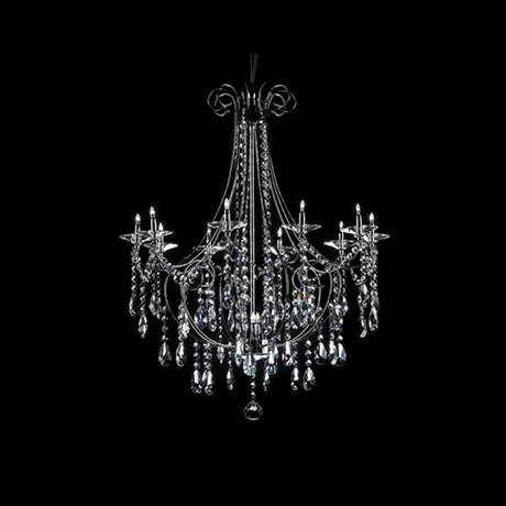 Люстра 15-ти рожковая на хромированной арматуре. Дизайн ламп выполнен в виде свечей в подсвечниках. Декор: прозрачные хрустальные бусы и стеклянные чашечки на арматуре. Высота светильника регулируется до 133 см.