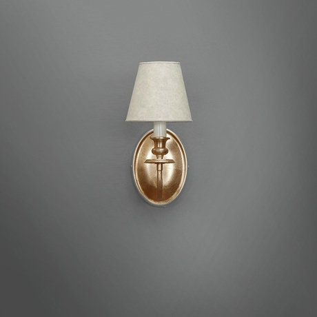 Арматура бра из металла золотого цвета. Текстильный плафон бежевого цвета скрывает лампу. Дизайн: Karen Lenz.