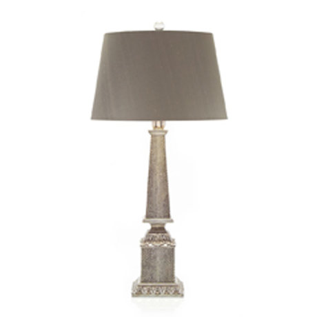 Основание лампы выполнено в виде серебрянного обелиска с рисунком под питона, украшенного листьями аканта. Абажур серого цвета. Лампа рассчитана на 150 Вт.
