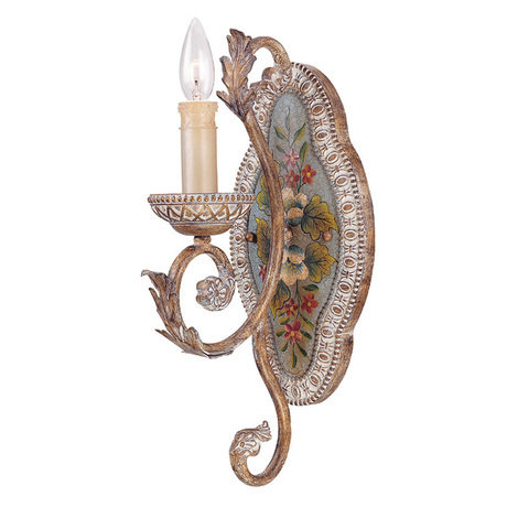 Бра однорожковое на арматуре из тополиного дерева. Декоративная свеча бежевого цвета. Декор: ручная роспись цветными красками с эффектом состаривания. Цвет арматуры: слоновая кость с голубым оттенком. Количество лампочек: 1. Мощность: 1 x 60 Вт. Тип лампы: Накаливания, E14.