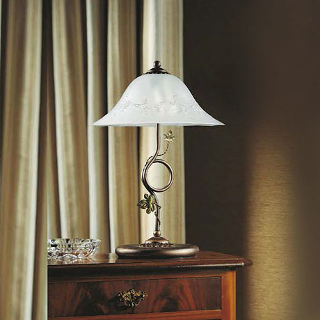 Настольная лампа на металлической арматуре бронзового цвета с патиной. Структуру украшают декоративные металлические завитки и листья зеленого цвета. Плафон выполнен из матового белого стекла. Количество лампочек: 2 Мощность: 2 x 60 Вт Тип лампы: Накаливания, E27.