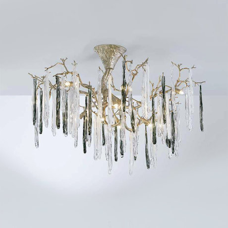 Потолочный светильник из коллекции Glamour. Дизайн выполнен в виде дерева со сплетением ветвей. Цвет металла бронзовый. На ветвях разноцветные подвески-капли из муранского стекла: светло-зеленые, болотного цвета, золотые, прозрачные. Возможны другие варианты по цвету стекла и покрытию металла. Идеальные пропорции и изящные линии сочетают в себе классические традиции и новаторство нашего времени. Все изделия Serip изготавливаются вручную, имеют органичные формы и цвета, вливаются в интерьер, делая его утонченнее и ярче. Количество лампочек: 12. Мощность: 12 x 40 Вт. Тип лампы: Галогенная, G9