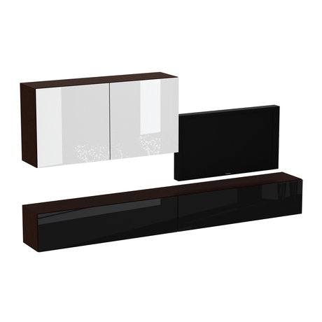 Композиция для гостиной. Все модули коллекции Сubo крепятся к стене. Двери шкафов и выдвижные ящики открываются по принципу «нажал-открыл».