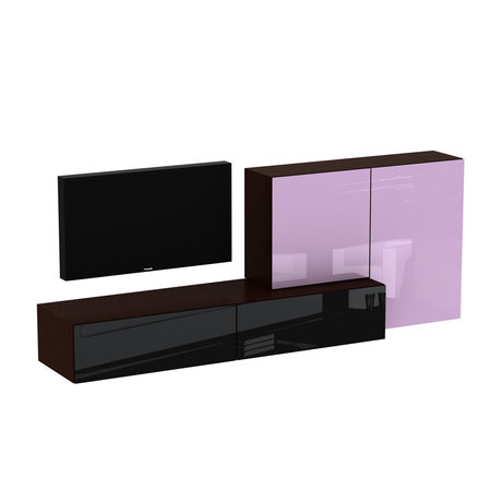 Композиция для гостиной. Все модули коллекции Сubo крепятся к стене. Двери шкафов и выдвижные ящики открываются по принципу «нажал-открыл». Глубина шкафов: 37 см.