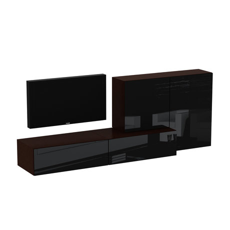 Композиция для гостиной. Все модули коллекции Сubo крепятся к стене. Двери шкафов и выдвижные ящики открываются по принципу «нажал-открыл». Глубина шкафов: 37 см.
