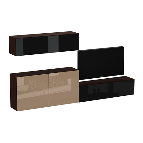 Композиция для гостиной. Все модули коллекции Сubo крепятся к стене. Двери шкафов и выдвижные ящики открываются по принципу «нажал-открыл».
