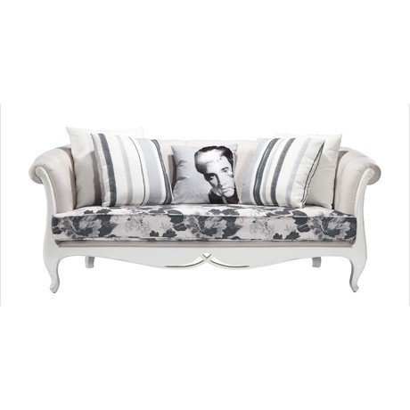 Диван трехместный на гнутых ножках выполнен в классическом стиле. Отделка молочно-белый матовый лак. Обит натуральной тканью из ассортимента фабрики (как на фото). Оригинальность модели обусловлена гнутыми подлокотника и фигурным основанием. Каркас сделан из массива тополя.
