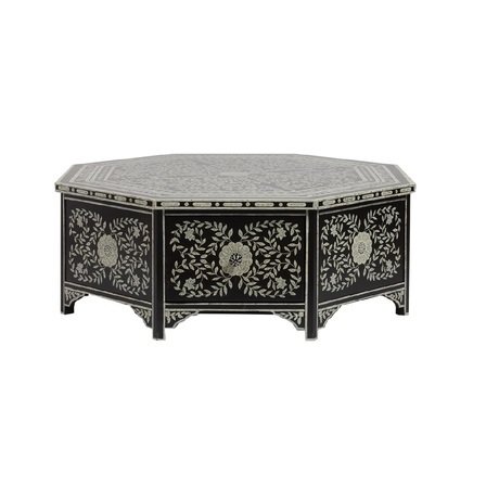 Этот низкий кофейный столик в монохромной гамме – настоящее произведение искусства. Он выполнен из дерева в черном цвете и расписан в ручную. Столик покрыт флоральными узорами. цветами и листьями, практически по всей поверхности. Он имеет форму восьмиугольника, по бокам расположены функциональные ящики для хранения. Этот столик станет достойным украшением гостиной в классическом стиле или в стиле ар-деко.